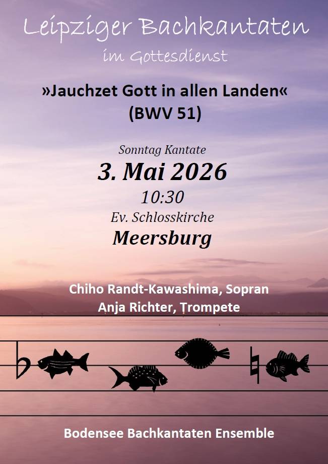 Am Sonntag, 3. Mai, gelangt die Solokantate für Sopran, Trompete, Streicher und Continuo „Jauchzet Gott in allen Landen“ (BWV 51) im Gottesdienst der evangelischen Kirche Meersburg zur Aufführung. In Bachs Schaffen nimmt diese Kantate durch ihre hohe Virtuosität eine besondere Stellung ein. Es ist kaum vorstellbar, dass das Werk für Sopran-Solo (mit dem einzigen c³ im gesamten Bach-Œuvre) ursprünglich einem Knabensopran des Leipziger Thomaner-Chores zugedacht war. Vielmehr erscheint es plausibel, dass die Familie Bach das Werk bei Reisen zu festlichen Anlässen im Gepäck hatte und dass Bachs zweite Frau Anna Magdalena, von Beruf „fürstliche Sängerin“ am Köthener Hof, den Solopart übernommen hat.